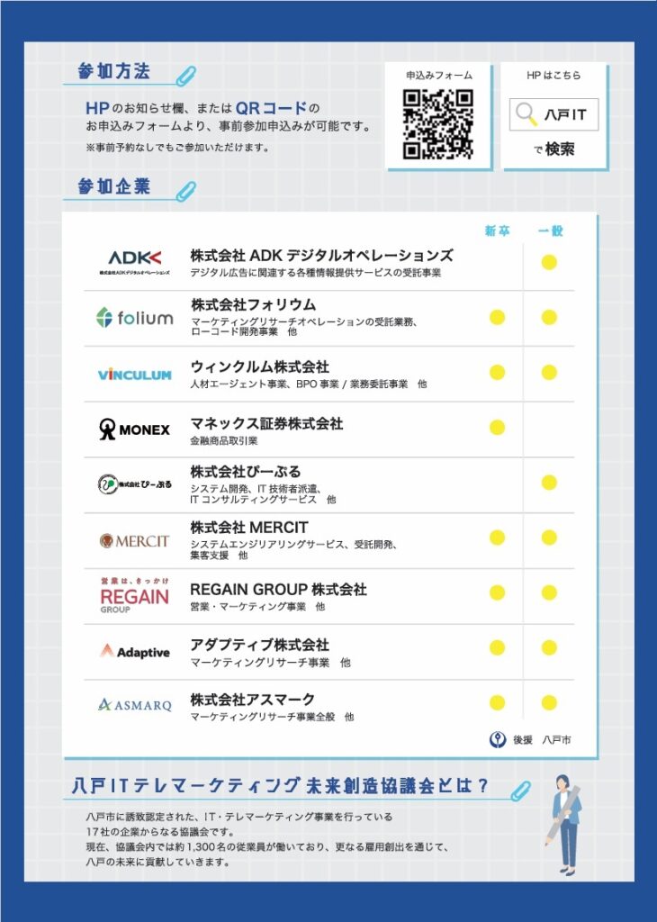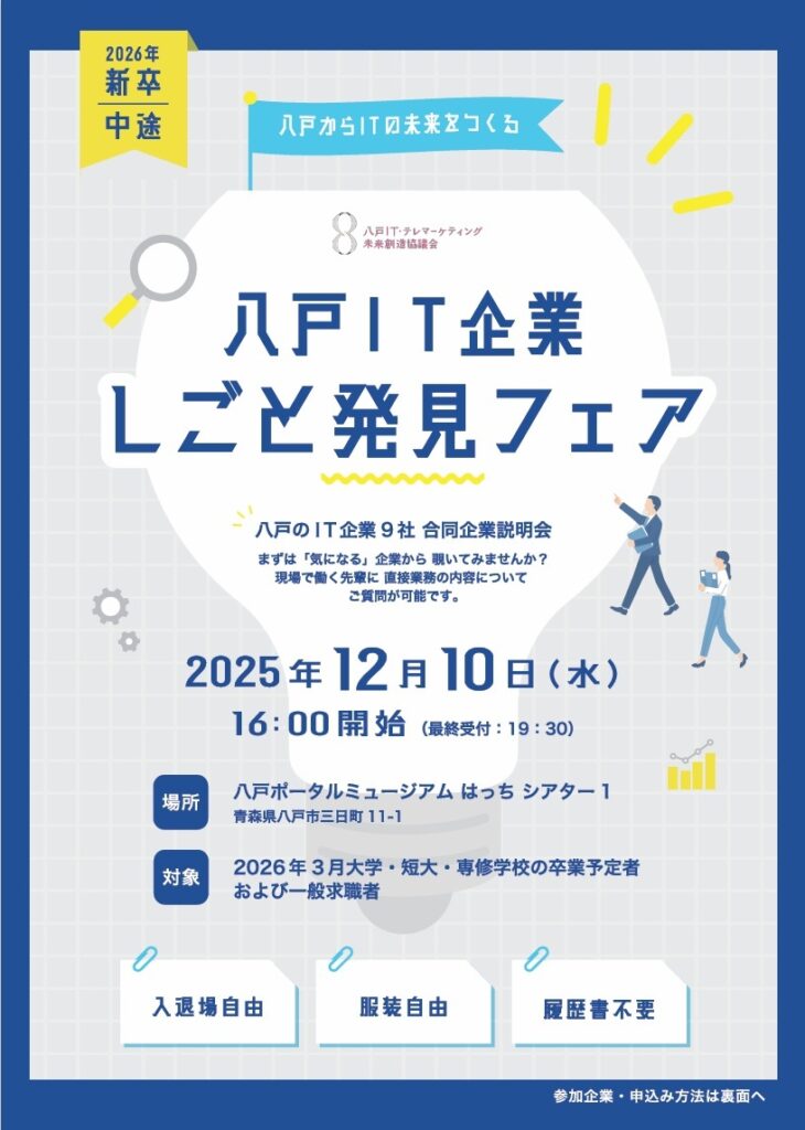 NEWS「八戸IT・テレマーケティング未来創造協議会」主催の合同企業説明会【八戸IT企業 しごと発見フェア】に参加します!